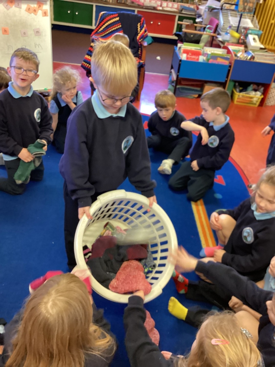 Our classroom was full of colour as we paraded around in our odd socks. We had spotty socks, stripy socks, animal socks, frilly socks, fluffy socks and many more. We had fun describing the socks we were wearing and how they were different. Then we matched a basket of socks to try to find the odd one.
